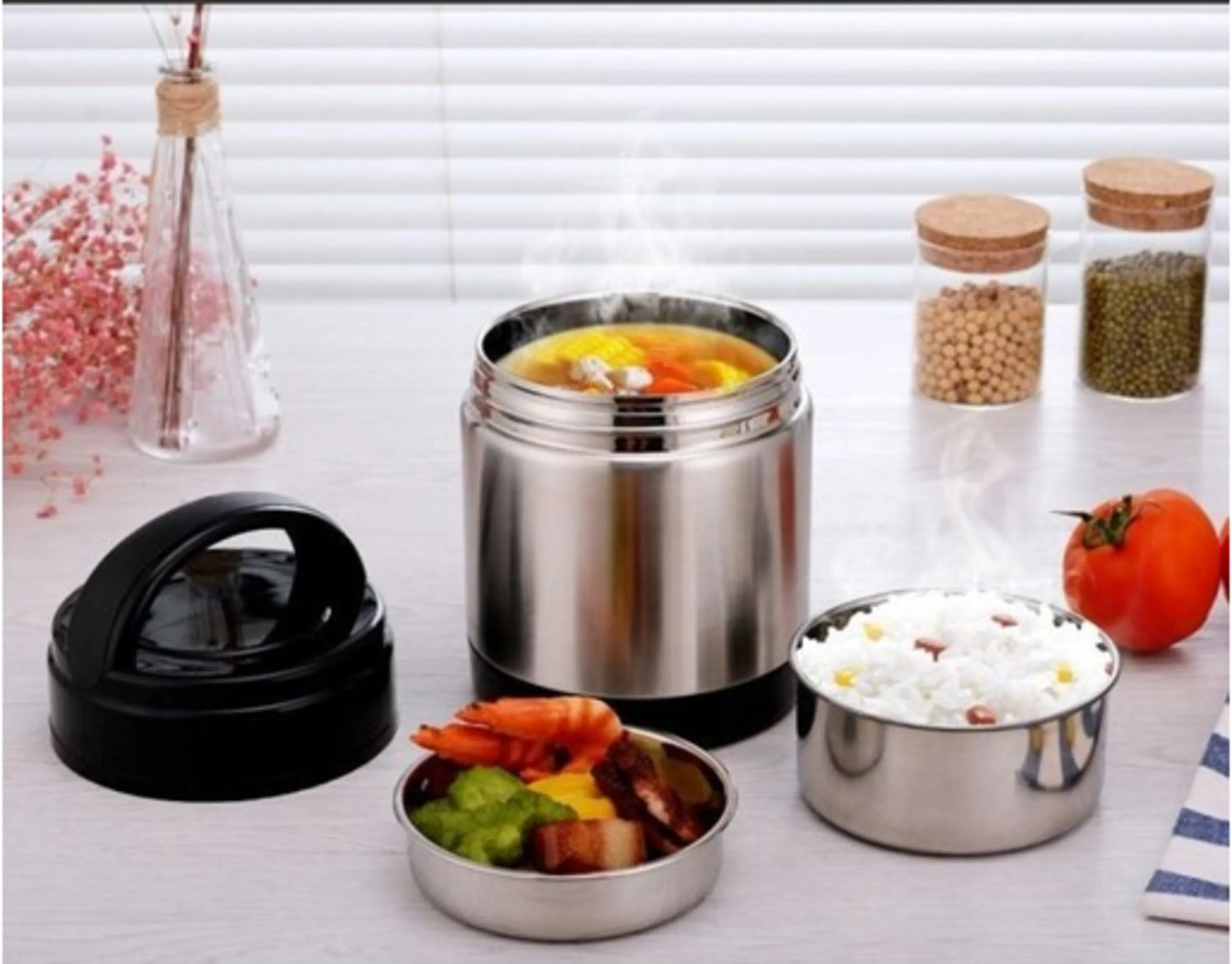 فلاکس غذای مسافرتی برند هات پوت استیل سایز بزرگ حجم1800میل درب پیچی کیفیت عالی مناسب برای مسافرت واشر دار،بدون نشتی قابل استفاده 3طبقه ی مجزا